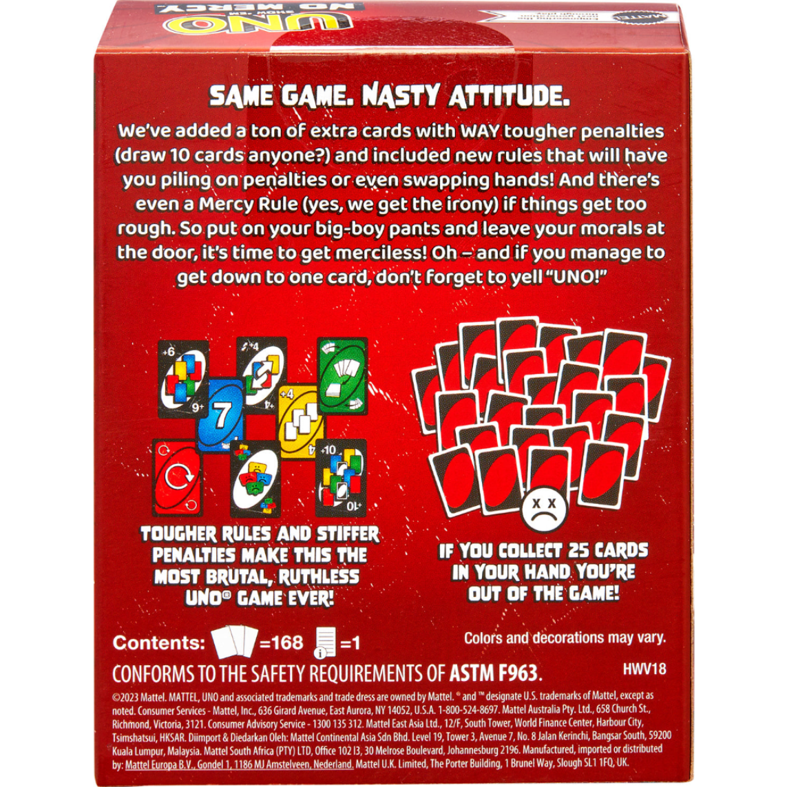 The UNO you know and love... but WAY more brutal, ruthless, and unapologetic. It has a ton more cards with WAY tougher penalties (draw 10 cards anyone?) and new rules that will have players stacking, swapping and drawing more cards than ever before! And there's even a Mercy Rule (yes, we get the irony) if things get too rough. Don't let your hand get up to 25 cards, or you're out! There are two ways to win in this merciless version of the classic game: get rid of all cards OR knock all other players out of the game. Oh and if you manage to get down to one card, don't forget to yell 'UNO!' For 2-6 players.