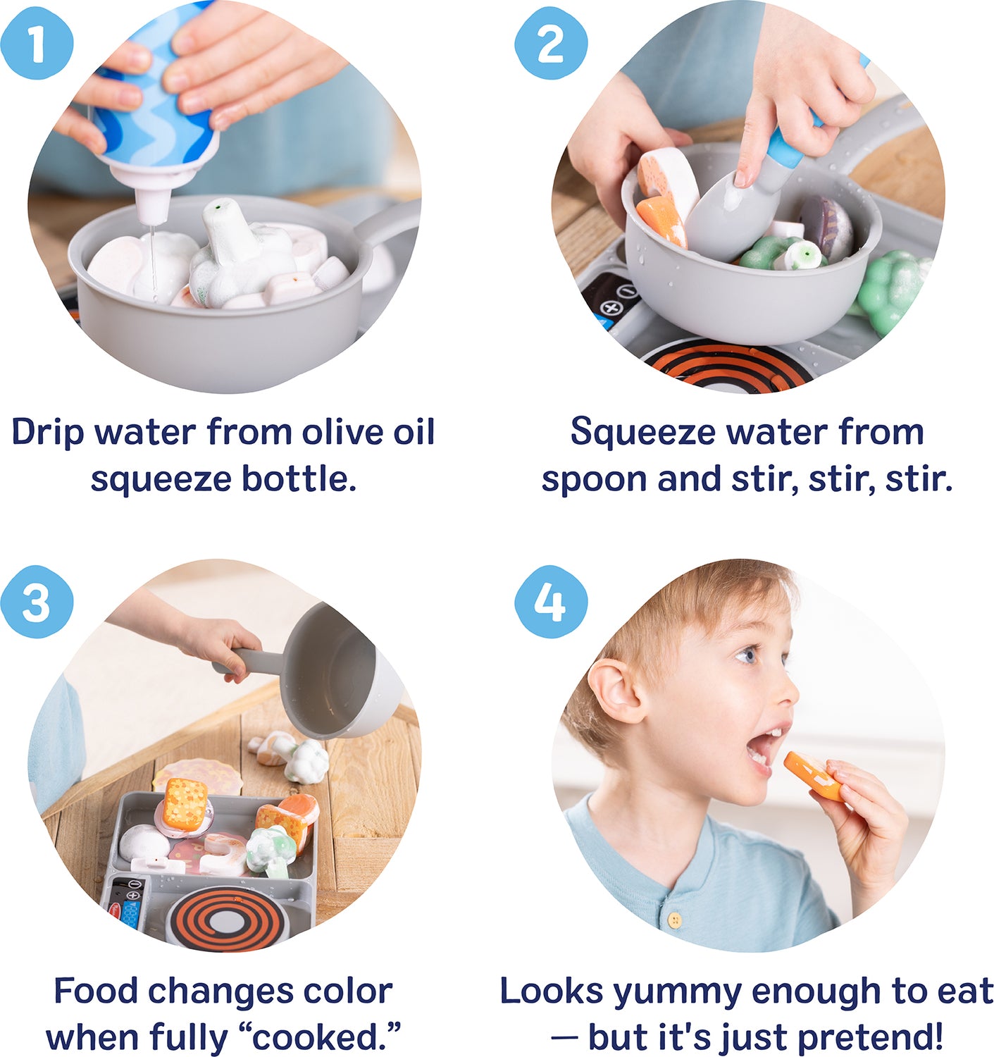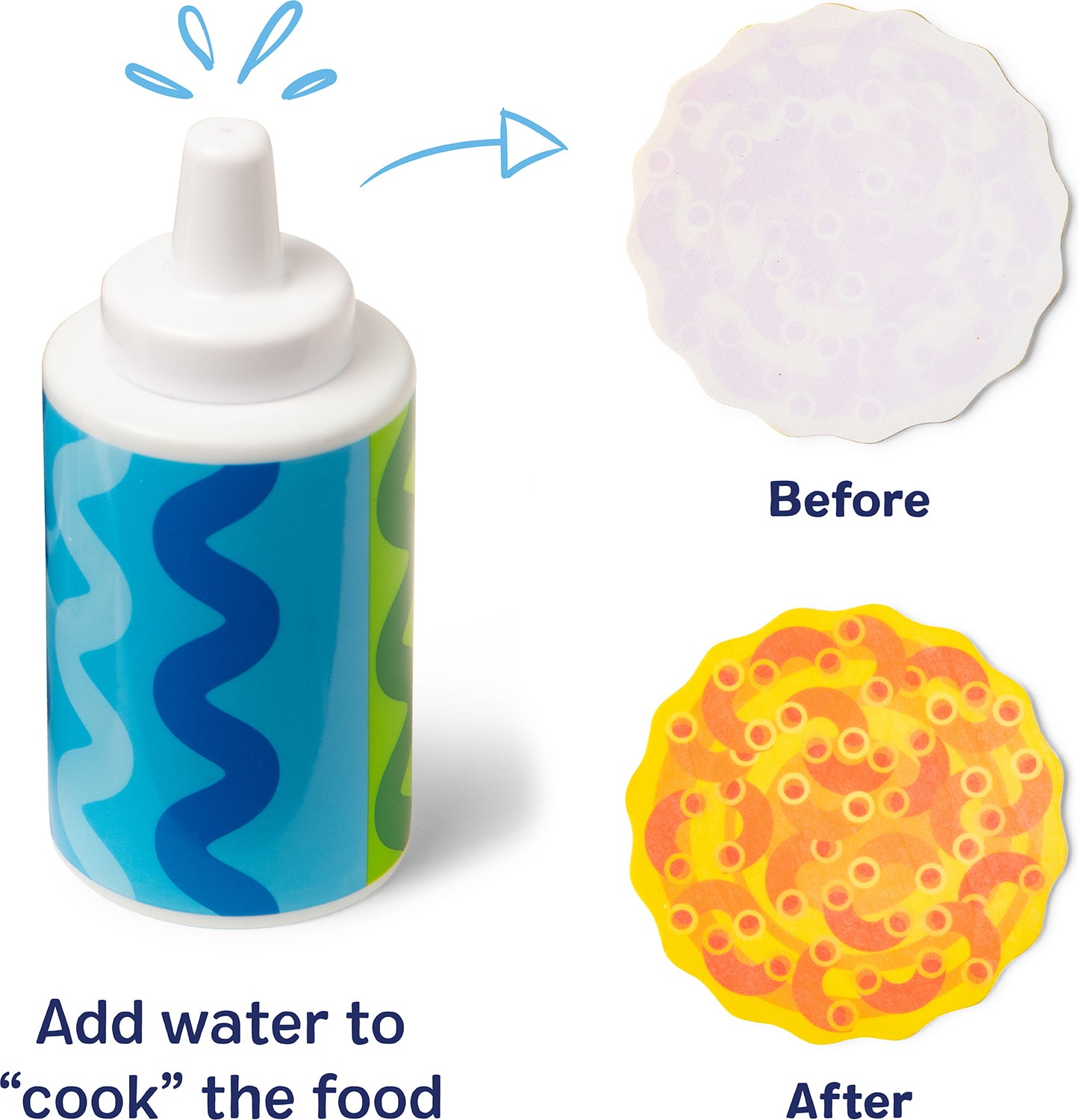 - Squeeze water from spoon or drip from olive oil squeeze bottle to change play food from "frozen" to "cooked"