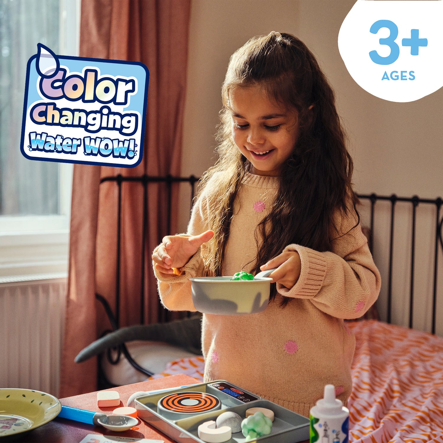 - "Cook" with water again and again with color-changing play food and stovetop play set