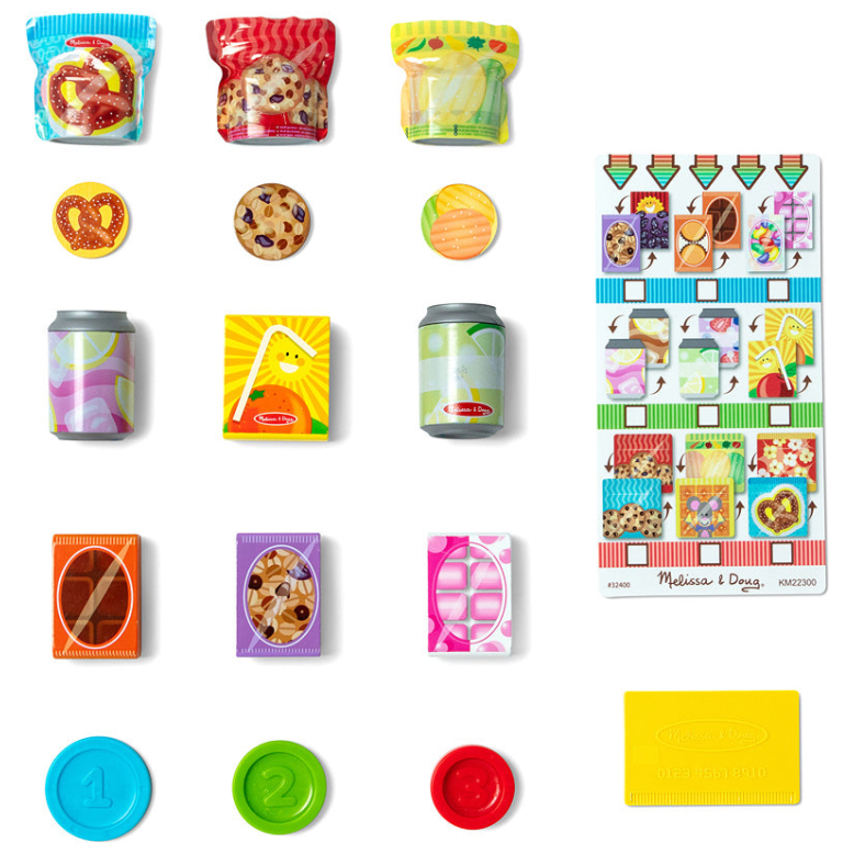 Satisfy hungry imaginations with the push of a button! We love the early learning skills and endless play possibilities of this battery-free wooden vending machine. Open the back and stock it with 9 double-sided play food packages, including snack bars, drinks, and pouches. On the front, select an item, insert a color-matching play coin or bank card, press the corresponding letter and number button, and the snack drops into the collection drawer! Personalize the sign and write on the reusable activity card to track snack inventory. Vending machine measures 17" x 12.5" x 5.5" and requires no assembly. Encourages letter, number, and color recognition, sorting, matching, counting, and fine motor skills. All the pieces store inside for easy cleanup!