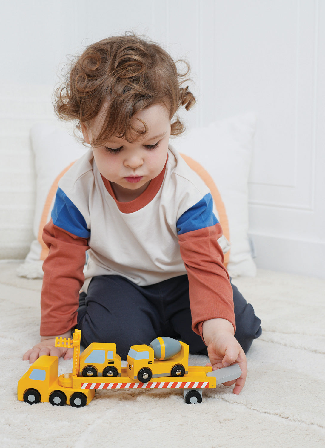 Enter the worksite and get ready to build years of imaginative adventures with this heirloom-quality wooden construction vehicle transporter! Hook the flatbed trailer onto the cab, lower the ramp, drive the cement mixer and forklift onboard, and roll off to the next building site! Combine with household block sets for more open-ended play adventures.