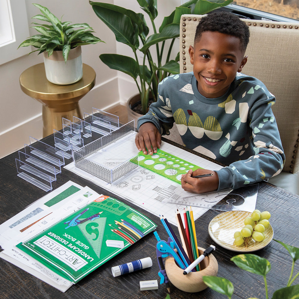 Aspiring architects and future exterior designers can practice their skills and bring their dream backyards to life with this hands-on introduction to landscape design! The included guidebook inspires imagination while teaching real-world design skills - empowering kids to sketch, plan, and model their very own 3D outdoor space. From placing pools and drawing decks to designing umbrellas, patio furniture, and lush greenery, creativity meets strategy in every step. Real architectural tools put the power in their hands: a drawing triangle, circle template, compass, tracing paper, grid paper, plastic design surface, 10 colored pencils, dry erase marker, eraser, glue stick, acrylic fences, and vinyl fence clings. This kit fosters spatial awareness, artistic expression, and thoughtful planning - all while making STEM learning feel like play. An unforgettable gift that inspires big ideas and even bigger dreams!