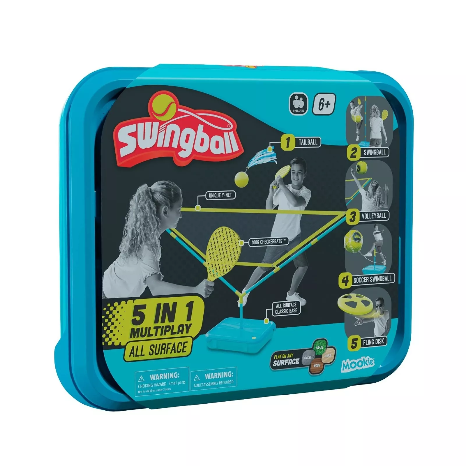 SWINGBALL SET: Get outside and play with the Swingball 5 in 1 Set! In an easy-to-carry case, you can play swingball, soccer, volleyball, tailball, and disc toss with family and friends.