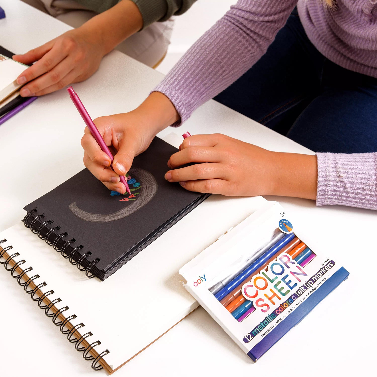 Add extra shimmer and shine to notes, cards, or illustrations with metallic markers! These round-tip fine-line markers write beautifully on both white and black papers. We love them as a gift for birthdays, Easter, or to make schoolwork more magical. Includes 12 different colors.