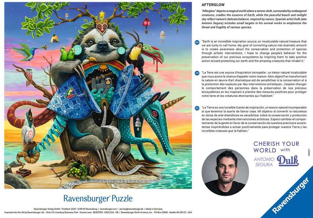 Our “Afterglow” puzzle depicts a magical world where a serene sloth, surrounded by endangered creatures, cradles the essence of Earth. A vibrant quetzal and toucan symbolize freedom and harmony. An aardvark stands vigilant while the serene beach and twilight sky reflect nature's delicate balance. Part of our “Cherish Your World” series, the artist Dulk includes small targets in his surreal works to emphasize the fragility of, and threat to, nature with hope of inspiring us to protect our planet!