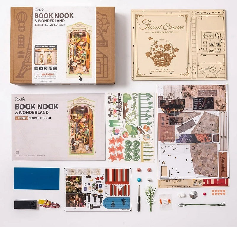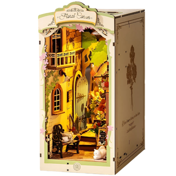Step into Annabel's Flower Shop, a dreamy wonderland of blooms and colors tucked away in a quaint alley. This store may be tiny, but the variety of flowers and plants for sale is enormous! Just ask, and the shopkeeper can create the bouquet or arrangement you desire to brighten moods, warm the heart, relax the mind, and heal the soul. Be captivated by the colorful petals, the detailed storefront, and the old-world vibe of the shop. Embellished with a tiny chalkboard, an inviting doorway, and even a cat to greet you, you will absolutely feel warm and welcomed in this cozy space. Rolife Floral Corner is an amazingly intricate book nook that includes a transparent protective sheet so you can display it without fear of it collecting dust. Turn on the light using the switch and you get an elegant and artful showcase that's small yet blooming with personality.