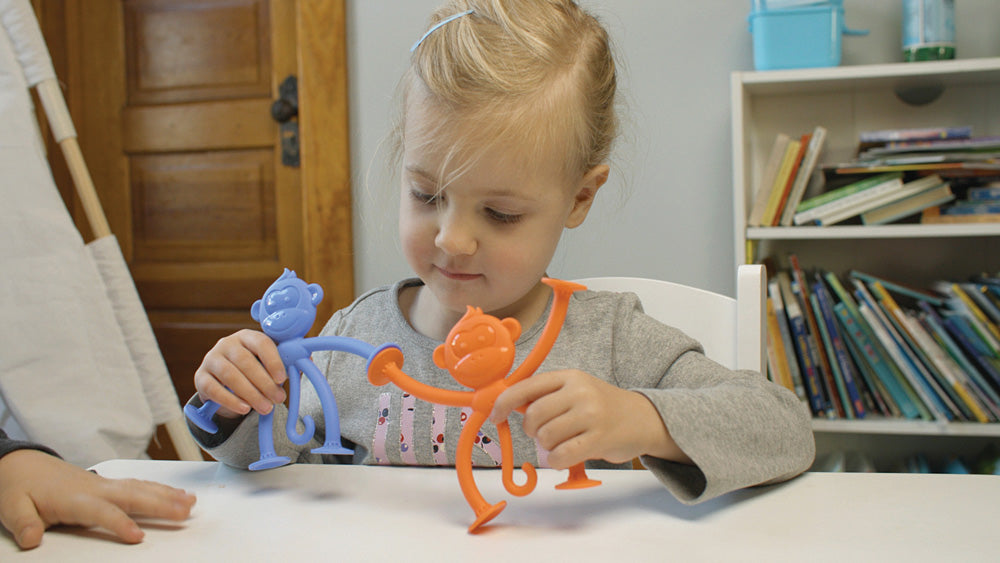Babies go bananas for these monkey-shaped teethers! Each pack comes with 6 colorful HangaTangs made of textured food-grade silicone. Their hands and feet have suction cups - stick them to surfaces or link them together! We love the versatile play opportunities on high chairs, strollers, in the tub or the car... plus, they're dishwasher safe!