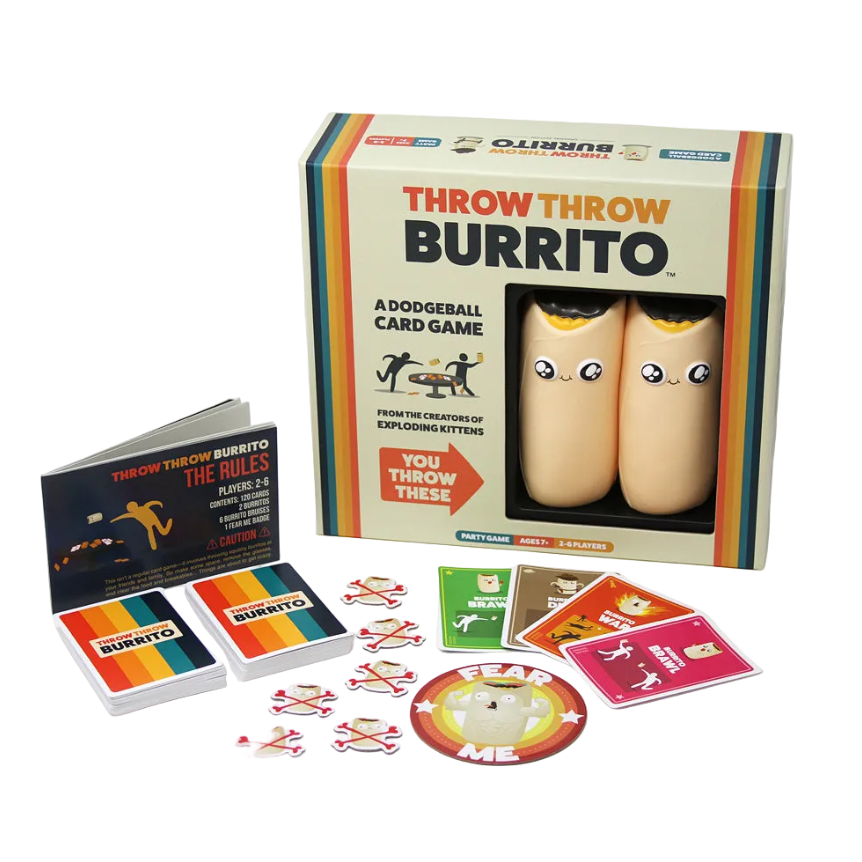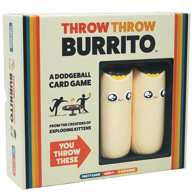 Who ever heard of a dodgeball card game? It's like Nerf meets Uno - with hilarious action involving 2 squishy burritos you use to brawl, duel, or wage war. Age does not matter - children and grownups alike will love this new game. For 2-6 players.