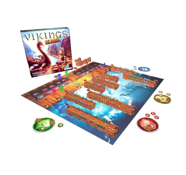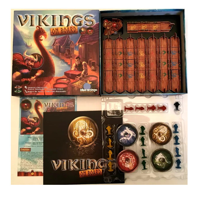 Prepare yourself for the season of exploration! Vikings on Board is a big box, family strategy game in which you will use your Viking tokens to claim actions on the board which best benefit your clan’s voyage. The ships are composed of several different segments, which switch from ship to ship based on the actions you claim. Your goal is to have the most of your clan’s pieces on a ship when it set sail, to claim the biggest portion of its points. Pay close attention: your rivals will be eager to change the composition of your ships, as well as the value of their merchandise!